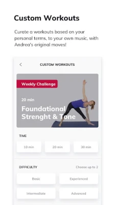 Whether you need a kickstart, want to avoid the dreaded plateau or are simply combating boredom, Andrea will give you optimized options that level up as you do and keep you from ever feeling alone!