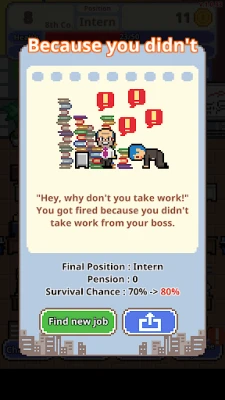 ‘Don’t get fired!’, is a survival game where you get to play a character who has no money, no connections whatsoever. You need to make him climb up the company ladder from an ‘intern’ to the ‘president’.