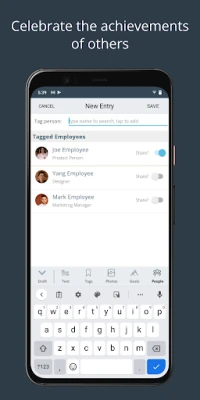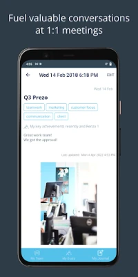 Employees can capture successes and feedback on the go. Share it with others (in particular their managers), and link their ongoing successes to their goals. Even take a photo or selfie to capture that great moment.