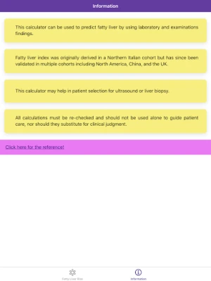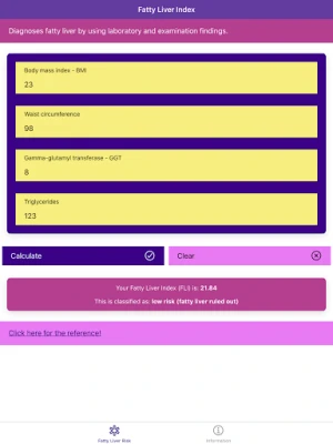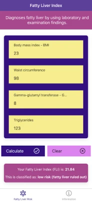 "Fatty Liver Risk - Screening of Liver Health" is a medical tool to predict whether you have fatty liver from clinical examination findings and laboratory results. It requires the user to input body mass index (BMI), waist circumference, gamma-glutamyl transferase (GGT), and triglicerydes. The "Fatty Liver Risk - Screening of Liver Health" app will then classify the risk into 3 categories (low, intermediate, and high risk). This "Fatty Liver Risk - Screening of Liver Health" is intended to help medical practitioner to calculate the risk of a person diagnosed with fatty liver by calculating the fatty liver index.