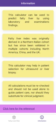 In low risk (fatty liver index < 30), fatty liver could be ruled out. And in high risk people (fatty liver index > 60), fatty liver could be ruled in. In people with intermediate or high risk result, consider to have ultrasound examination for confirmation of the fatty liver disease. This "Fatty Liver Risk - Screening of Liver Health" app could be used by anyone who has risk factors of fatty liver, such as being obese or overweight, having type 2 diabetes or insulin resistance, and having metabolic syndromes. Earlier fatty liver diagnosis could lead to earlier treatment and better outcome. We hope this "Fatty Liver Risk - Screening of Liver Health" app can be used widely.
