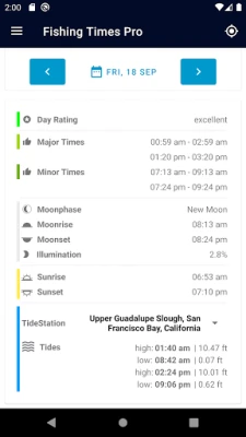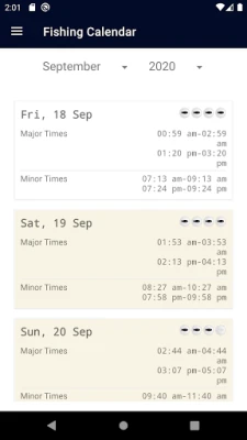Fishing Times provides you with an easy-to-read interface for current, past and future fishing conditions. Major and Minor Times, Day Ratings, Tide Times, Sunrise, Sunset, Moonrise, Moonset and Moonphase are displayed in a 24-hour Solunar Clock view and can also be viewed in a calendar format.
